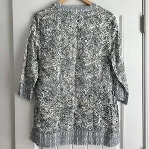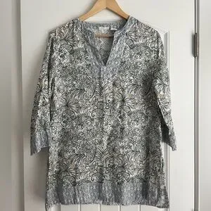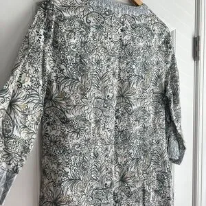 Chic linen tunic with intricate floral design. Soft gray tones. Perfect pull over to add pattern to any outfit!