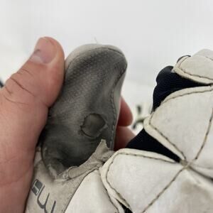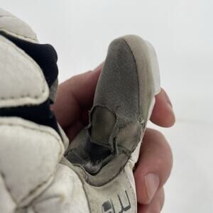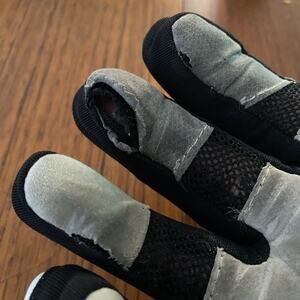 Good preowned condition. Middle finger on right hand has a hole. Wear on thumbs and palms shown in pics.