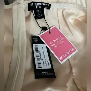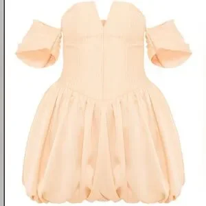 Keywords: PrettyLittleThing, PLT Plus, bubble hem dress, runway trend, party dress, satin dress, Bardot dress, off-shoulder, shift dress, size 12, NWT, cocktail dress, trend 2025, volume hem, statement dress