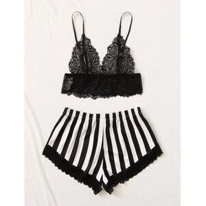 Floral Lace Bra With Striped Shorts Lingerie Set