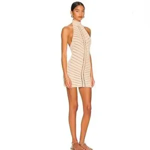 NWOT $218 Revolve Camila Coelho Lyssa Hand Crochet Halter Mini Dress in Sand Med