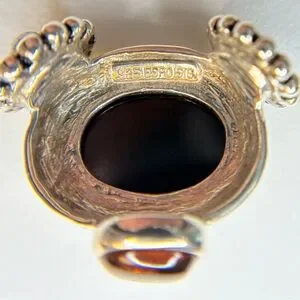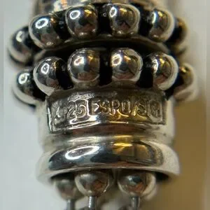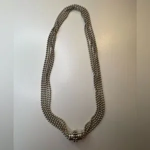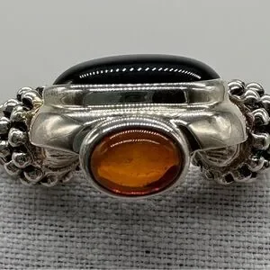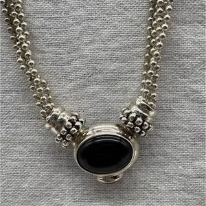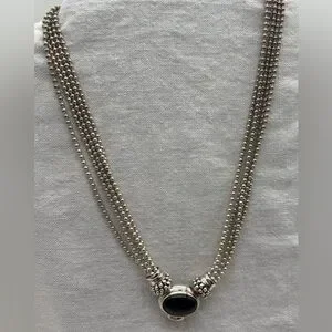 Joseph Esposito sterling silver multi-chain necklace with removable pendant. The beaded chain is 5 strands which can be worn as a single piece,with the pendant attached or with other Esposito pendant attachments (I have just the one being sold along with its chain in this listing). The pendant is an oval shape onyx with amber cabochon at bottom. This is a beautiful. Any scratches are consistent with;normal wear. Marked 925 ESPO