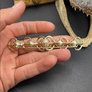 Stunning vintage washed out gold tone with black and brown rhinestones bar brooch by Sarah Coventry 3.5 inches across.
