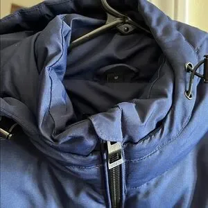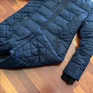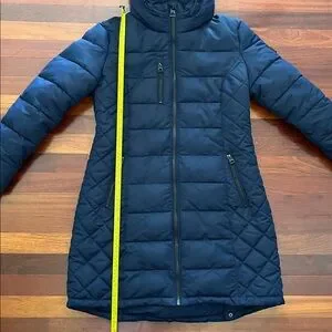 This is a beautiful and warm dark blue long Guess medium jacket with hood. black hardwear.