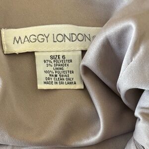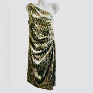 Maggie London one-shoulder, ruched dress Size 6 Maggie London is a fashion brand that specializes in creating dresses for various occasions. This features an elegant design, including ruched details and sophisticated print. Satin, metallic shades.