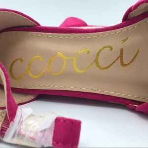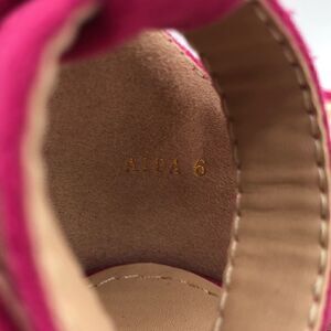 Pink strap around the ankle, braided suede, and 2” flatform heel