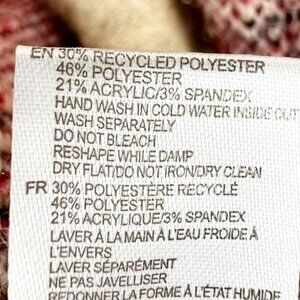 - 30% recycled polyester, 46% polyester, 21% acrylic, 3% spandex