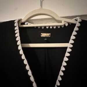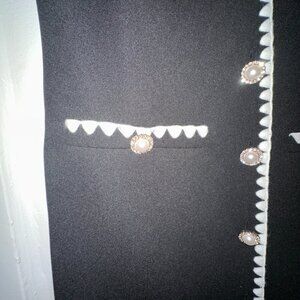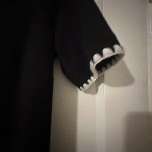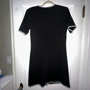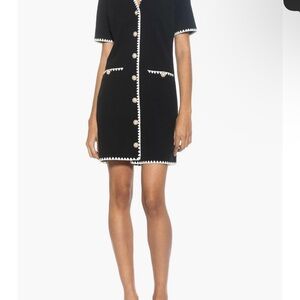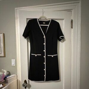 Chic and timeless, this short-sleeve black dress features classic white trim and pearl-style buttons for a touch of sophistication. Perfect for brunch, work, or an evening out.