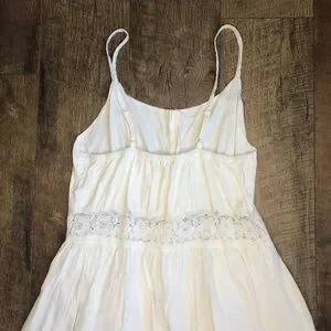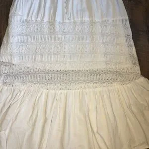 This flowy lace long boho style dress features functional buttons down the front, spaghetti straps with elastic around the back. There is a cotton slip under half of the dress allowing the unique design at the bottom to be seen.