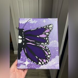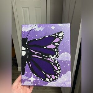 Elegant butterfly painting with bold purple and black wings. Metallic purple background!! White accents add contrast. Perfect for adding charm to any room.