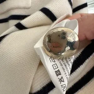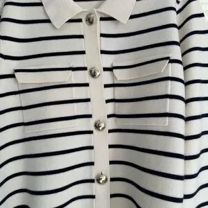 Stylish Sezane cardigan with bold black stripes. Features gold buttons. Perfect for layering.