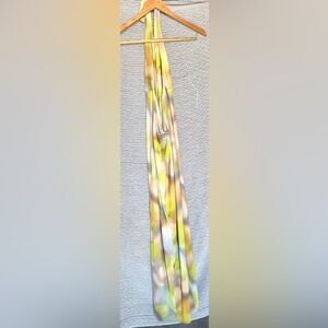 Midi halter neck dress with tie and V-neck. Interior lining. Back hidden in-seam zip closure. Perfect for that beach vacation or special occasion birthday anniversary