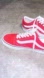 Bold red Vans sneakers with white detailing. Features classic lace-up style. Great condition!