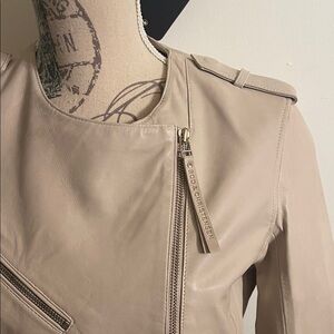 Step out in style with this elegant cream leather jacket. Perfect for any occasion, it offers a blend of sophistication and comfort.