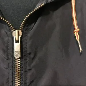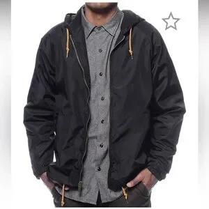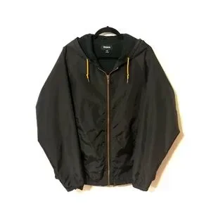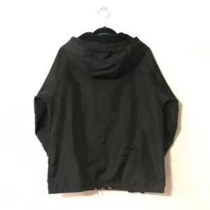 Sleek black windbreaker with hood. Leather logo accent and accent drawstrings at the neck and waist, adjustable for warmth.