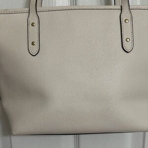Chic Coach City Mini tote in off-white leather. Features gold-tone accents. Ideal for everyday elegance.