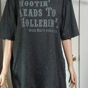 Gray T shirt featuring Hootin leads to Hollerin from Wild Bill's in Dallas Texas