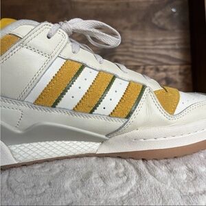 Excellent preowned condition. Smoke free. Pet friendly home. Clean. The Adidas Men’s Forum Low Classic Originals in Cream/Bold Gold is a stylish and classic sneaker designed for various athletic activities such as walking, cycling, basketball, football, and running. Featuring a low-top shoe shaft style, colorblock pattern, and leather upper material, this shoe offers excellent arch support and cushioning for comfort. With a sleek and minimalist design, the adidas Forum Low is a timeless piece from the adidas Forum product line that is perfect for those looking for a versatile and reliable athletic shoe.