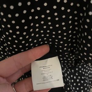 100% silk polka dot ruffle sleeve dress. The collar is pointed and there are buttons 3/4 down the front. It has a matching sash. This dress is perfect for work or play.