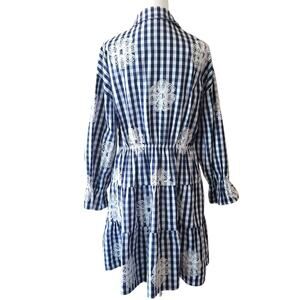This Gracia Floral Embroidered Gingham Check Mini Dress in navy and white features a collared neckline, button-down front, long sleeves with ruffled cuffs, and a cinched waist. The dress has a tiered skirt and is adorned with floral embroidery throughout. The dress is made of 60% polyester and 40% cotton and is perfect for all your warmer weather events.