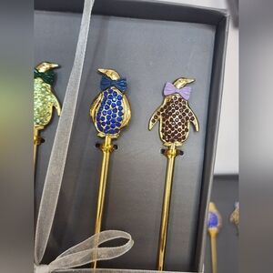 Set of Thirstystone gold-plated metal stir sticks with colorful penguin designs. Perfect for party cocktails and home entertaining. Also great gifters and last-minute gifts.