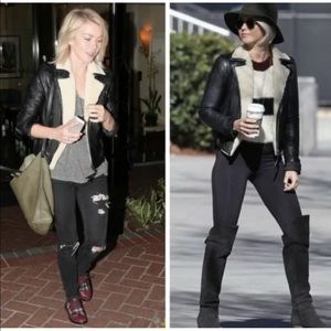 Joie Ailey 100% leather jacket with shearling collar. As seen on celebrities like Julianne Hough. The only flaw is that the inside of the brand label is peeling off so I ended up just scraping all of it off but this does not affect the outside of the jacket. Other than that, the jacket is in excellent condition. This retails for over $800 and I am selling it for only $75.
