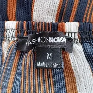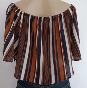 Trendy off-shoulder crop top with bold stripes. Features black, white, and brown colors. Ideal for casual outings.