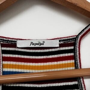 Cute and trendy papaya brand women’s colorful striped halter dress. Features colorful striped pattern, spaghetti, straps, adjustable, stretching, material,m, and mini length.