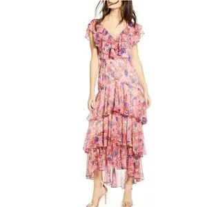 Wayf Pink and Purple Floral Tiered Ruffle dress