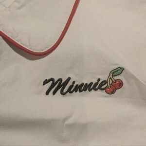 Charming Disney shirt in white with red accents. Features button-up design. Design reminds me of the 50s diner shirts. The word Minnie is printed on the chest and Minnie Mouse is printed on the back.