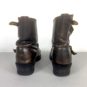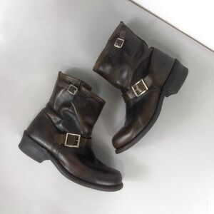 Frye 8R Engineer Boots in a rare color way that has distressed and variated warm brownish tones.