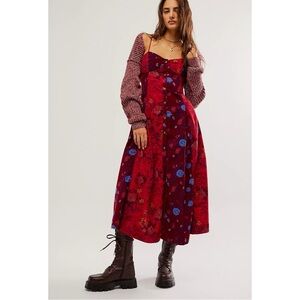 Free People Bohemian Grunge Witchy Corduroy Gail Midi Dress Scarlet Combo Medium