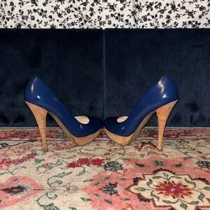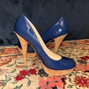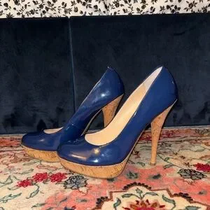 Glossy navy platform heels with chic cork detailing — bold, classy, and perfect for a night out 💙✨ Adds instant height and confidence. In good condition and super stylish!
