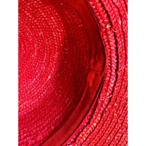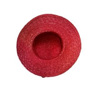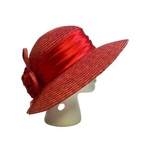Add a touch of elegance to any outfit with this beautiful bright red derby hat. Crafted from high-quality straw, this wide-brimmed hat features a stylish satin band and a charming fabric rose embellishment. Perfect for special occasions, garden parties, or a day at the races, this hat will make you stand out with its vibrant color and sophisticated design. The wide brim provides excellent sun protection, while the intricate details add a touch of class! # 1676