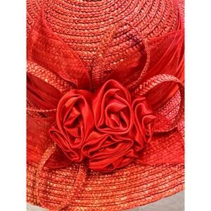 Bright Red Women's Derby Wide Brim Straw Embellished Hat Satin Band Fabric Rose