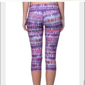 Alo purple, orange green cropped leggings in excellent condition. pocket in the front-No size tag but measures out a small.
