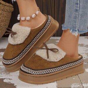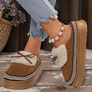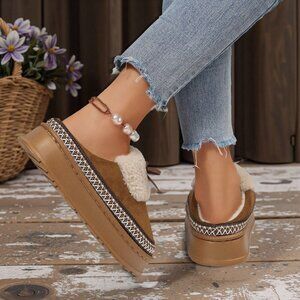 Camel Casual Women's Thick Flat Suede Shearling Slippers