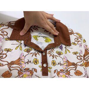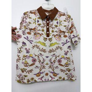 This Tory Burch Mercerized Printed Polo T Shirt is in good condition. Features the Ivory Rabbit Field print--a rabbit / bunny / animal floral print with a brown collar. Cotton, collared, short sleeves. There is wear and fading on the collar. There is minor wear on the rest of the shirt. There is a tiny speck on the back.