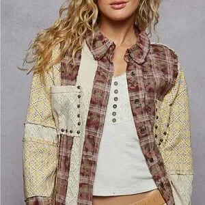 Elevate your style with this unique POL plaid patchwork jean jacket. Featuring a blend of red, cream, and yellow tones, it's perfect for a unique wardrobe addition. Perfect for layering. This eclectic top is designed for the stylish woman with a creative mind for many outfit uses! It has denim patchwork for a vintage appearance while giving boho vibes. Super cute!