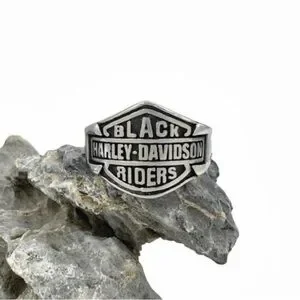Bold Harley-Davidson ring with black and silver design. Perfect for motorcycle enthusiasts.