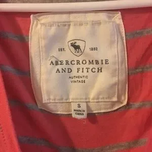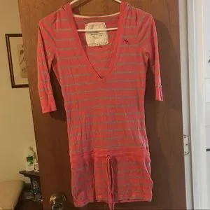 Stylish pink and gray striped top. Features a deep V-neck and three-quarter sleeves. Drawstring waist for a flattering fit.