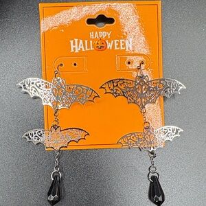 A fun touch of darkness and whimsy with silvery bats and a black teardrop bead. Metal and acrylic on fish hooks.