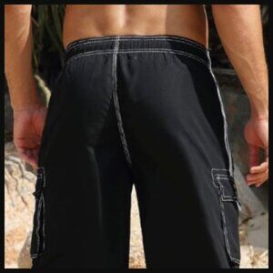 Stylish OP swim board shorts. Black with white accents. Features drawstring waist and side pockets.