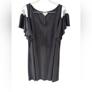 This elegant black midi dress features a stylish cold shoulder design, perfect for any occasion. Its sleek and sophisticated look makes it a must-have in your wardrobe.