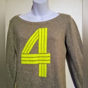 ladies gray sweater with neon yellow number four print design and trim. comfortable stretch material
