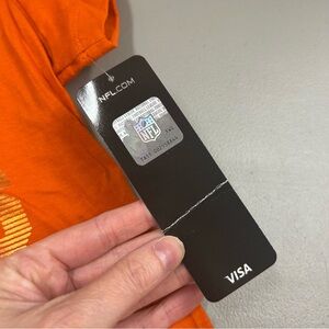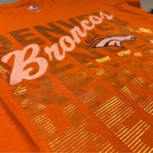 BRAND NEW AND SO CUTE! THE ORANGE TEE HAS BRONCOS ACROSS THE CHEST IN WHITE. THE BACKGROUND IS SHINY GOLD FOIL THAT READS DENVER.