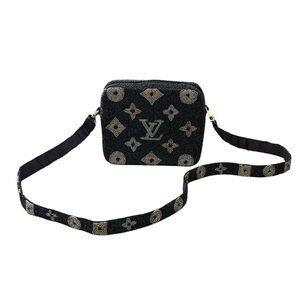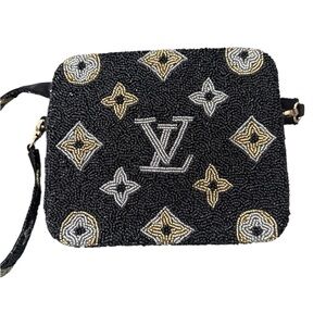 This stunning black evening bag features an exquisite all-over beaded design, offering a unique texture and sophisticated shimmer. The intricate beading forms a captivating pattern in contrasting gold and silver tones, adding a touch of glamour to any ensemble.