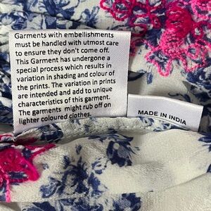 May be worn off the shoulder, dramatic tiered bell sleeves with beads, gathers at hem with embroidery and beads, belt loops at side seams.
