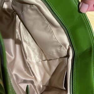 Chic and spacious leather tote by Coach. Features a vibrant green hue. Ideal for daily use. 14”