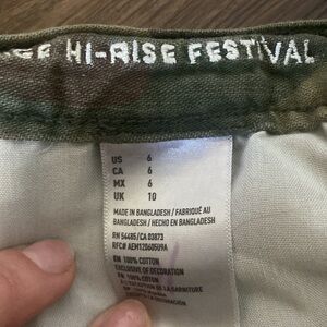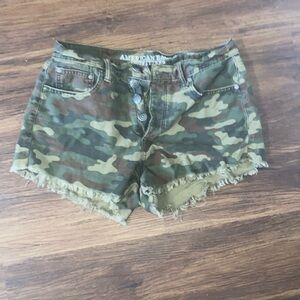 Trendy camo shorts with frayed edges. Features button fly and pockets. Ideal for casual outings.